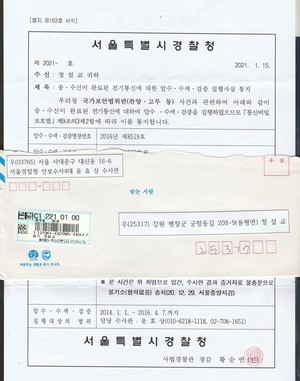민족작가연합 박 00 시인과 전화를 화고 있는데 무슨 난리가 났다는 것인지 누가 문을 쾅쾅! 아주 격하게 두드린다. 전화를 중단하고 문을 여니 뻘건 헬멧을 쓴 우체부다. 말도 없이 그는 현관으로 쑥 들어와 우편물을 내밀고 마치 내가 무슨 대역죄라도 저질렀다는 듯이 서명을 닥달했다.우체부를 보낸 후 확인해 보니 서울시경찰청에서 보낸 국가보안법 찬양, 고무 등 사건과 관련하여 2014~2016년 까지 송수신이 완료된 전기통신에 대하여 압수, 수색, 검증 집행서로 증거자료 불충분으로 불기소했다는 통지서였지만 내 가슴은 철렁