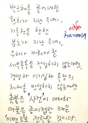횃불은 우리가 함께 가는 길을 밝히는 일이고,들불은 썩어빠진 그 모든 것을 불태우는 일이며,촛불은 우리 스스로의 자화상을 밝히는 일이다. 촛불이여,촛불의 마음이여,차가운 얼음과 같이바꿔야 할 목록을 작성해 가자.매서운 채찍과 같이체제의 내면화된 이기심(욕망)을 반성해 가자. 분명 촛불이 밝힌 만큼 세계는 변할 것이다.촛불이 밀어낸 어둠만큼 세계는 밝아질 것이다.촛불이 비춘 자리의 통점만큼 세계는 따뜻해질 것이다. 황경민 작가는 카페 헤세이티 종업원, 물장수, 입간판쟁이, 야매싱어송라이터이자 야매시인. 2012년 4월 물장사를 시작하