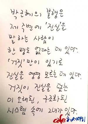 기실 그녀의 불행은 그녀만의 잘못이 아니다.지난 100년, 언제나 거짓이 이겨왔다.친일이, 친자본이, 친정부가, 친권력이 모든 것을 이긴 역사를 우리는 가지고 있기 때문이다.거짓이 성공이고, 진실이 실패라는 무의식이 우리 사회의 내면화된 자의식이기 때문이다. 그녀 역시 이 구조화된 시스템, 거짓이 진실을 이기는 시스템의 피해자 중 한 사람이다. 그 어떤 영웅이더라도 대한민국에 살면 '거짓'을 믿게 될 것이다.설사 신이라 하더라도 대한민국에 살면 '거짓말'을 하게 되리라! 우리가 만들어 가야 할 세계는 박