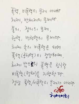 80년대 왜 학생들은 파출소(공권력)를 타격했는가?80년대 학생들은 왜 쇠파이프를 들고 화염병을 던졌는가?왜 학생들은 그렇게 '폭력'적이었는가?당시 남한 운동의 주력이었고, 선도적인 반군사독재투쟁을 벌인 80년대 학생들의 의식수준이 낮아서 그랬단 말인가?작금의 '시민의식' 따위가 없어서 그랬단 말인가? 학생들이 파출소를 타격한 것은 정권의 개들이 동지(동료)를 사냥해갔기 때문이다.학생들이 쇠파이프와 화염병을 든 까닭은 정권의 개들이 부당한 명령에 복종한 채 반독재투쟁(정의)에 대항했기 때문이다. 저들은
