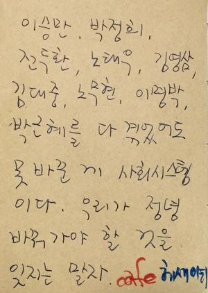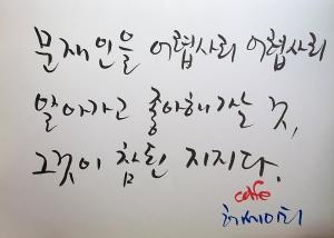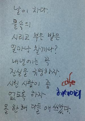 날이 차네요.한 해 잘 마무리하시고,감기 조심하시고,내내 청안하시기를 빕니다. 황경민 작가는 카페 헤세이티 종업원, 물장수, 입간판쟁이, 야매싱어송라이터이자 야매시인. 2012년 4월 물장사를 시작하면서 입간판 쓰기 시작, 지금까지 4년3개월 동안 2000편 이상 썼음. 세다가 헷갈려서 지금 안 셈. 카페 헤세이티는 부산의 부산대학교 앞에 있는 카페로 인문학강좌, 강연, 공연, 전시, 시인학교, 기타(노래만들기) 교실 등의 행사 및 프로그램 운영중. 주로 사회부적응자, 이탈자, 탈락자, 불만세력 등이 출입함. 맨날 적자니 누구든 와