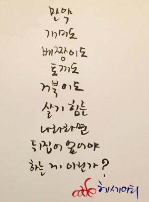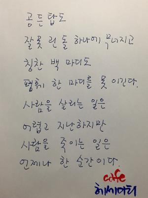 열심히 공부를 해도 힘들고,시험을 포기해도 힘들다. 대학을 포기해도 힘들고,대학에 진학해도 힘들다. 빚을 내 집을 사도 힘들고,빚 없이 세를 살아도 힘들다. 퇴직을 해서 장사를 해도 힘들고,퇴직할 기회 자체가 아예 없어도 힘들다. 유치원에 다녀도 힘들고,경로당에 다녀도 힘들다. 결혼을 안 하고 혼자 살아도 힘들고,결혼을 해서 같이 살아도 힘들다. 누구나 귀하게 유일하게 태어났는데그 모든 '누구나'는 비정규의, 계약의, 알바의, 일용의 가능성이다.그렇다면, 이 체제를, 이 나라를 뒤집어엎어야 하는 게 아닌가?단지 사람을