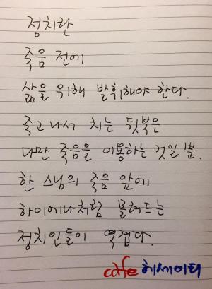 세월호 진실규명에는 손을 놓고 있던 정치인들이한 스님의 죽음 앞에 우루루 몰려들어 이 말 저 말을 보태고 있다.세월호 학살을 외면한 까닭은 촛불이 뜨겁지 않았고,권력이 아직 멀리 있었기 때문이고,스님의 죽음 앞에 몰려드는 까닭은 촛불이 뜨겁고,권력이 바로 눈 앞에서 어른거리기 때문이다.염불보다는 잿밥이라더니 '살림과 진실'은 외면하고밥상에 숟가락을 얹듯이 죽음에 기대 권력을 좇는하이에나들의 정치만 있는 나라.그리고 그 하이에나들에게 희망을 맡긴 촛불이라는 서글픈 민심.죽음도, 촛불도 소비되고 이용 당하는, 여전히 꽝꽝
