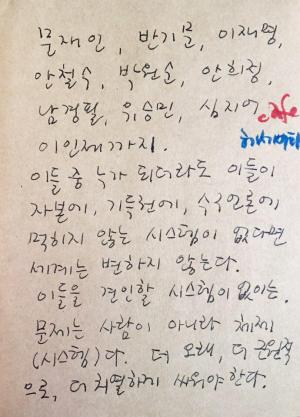 그래 맞다. 사람이 하는 일이고, 결국은 사람을 위한 일이다. 그래서 바꿔야 할 사람은 바꿔야 한다. 그러나 두 눈 부릅뜨고 지켜보자. 바꾼 사람이 무엇을 바꿔가는지, 바꾼 사람이 과연 바꿔가고 있는지, 바꾼 사람이 민중의 편에 서는지, 기득권의 편에 서는지, 바꾼 사람이 사회적 약자와 기층민중이 살아갈 수 있는 사회시스템을 만들어가는지 두 눈 부릅뜨고 지켜보고 견인해 내자.