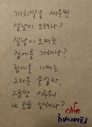 곧 설이다.아직 누군가는 차가운 물속에 있고,누군가는 머나먼 타국에 있고,누군가는 돌아갈 고향이 없고,누군가는 돌아가도 반겨줄 엄마가 없고,또 누군가는 돌아갈 자신이 없고, 그 누군가는 돌아갈 자기를 잃었다.나는 가난했던 그 어릴 적이 늘 그립고 더 행복했다. 식구들과 이웃들과 친구들이 밥을 나누고, 인정을 나누고, 우정을 나눌 줄 알던 그 때가. 닭장 같은 각자도생의 아파트, 원룸, 고시원, 골방이 아니라,경쟁, 경쟁, 경쟁, 쉼없이 밀려드는 경쟁의 파도를 넘어, 천애고아 같이 각개약진의 불안과 공포에 떨며 살아가는 외로운 생존이