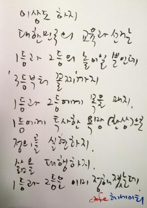언제까지 우리는 1등이 돼야 하나?언제까지 우리는 2등(야)을 1등(여)으로 만들어야 하나?언제까지 1등과 2등을 꿈꿔야 하나?언제까지 1등과 2등에게 우리의 희망을 투사해야 하나?언제까지 '3등부터 꼴찌'까지-실제 우리(민중)의 삶을 우리 스스로 배제시켜야 하나? 과연 언제까지 이겨야 하나? 성공해야 하나?왜 우리 삶의 전부인 '패배와 실패와 탈락의 현실'을 스스로 외면하고 방기해야 하나? '3등부터 꼴찌'까지가 애초부터 제외된 제도교육과 제도정치에 목 매야 하나?1등만이 2등이 되고,