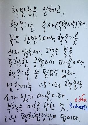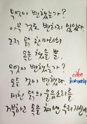 무엇이 변했는가?그 무엇도 변하지 않았다. 그저 미친 닭의 목을 쳐 냈을 뿐, 미친 닭을 키워낸 양계업자의 음모를 파악했을 뿐, 미친 닭은 목이 잘린 채 아직 울고 있고, 양계장 역시 아직은 그대로 있다. 닭을 키워낸 과거(역사)는 그 무엇도 변하지 않았다.무엇이 변했는가? 모든 것이 변했다. 미친 닭의 울음소리를 거부한 우리가, 기어이 닭의 목을 쳐 낸 우리 자신이, 더 이상은 양계업자의 음모를 용납하지않겠다고 선언한 시민의 눈이, 더 이상은 양계장이 아니라 광장에서, 들판에서 권력(민중권력)을 창출할 수 있다는 가능성을 움켜쥔