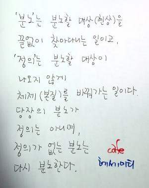 분노는 정의도, 정의감도, 양심도 아니다. 정의와 정의감에 기댄 분노도 있겠지만, 대개 무엇에 분노하는 건 제 심사와 맞지 않을 때다. 그것은 정의와 별 상관이 없다. 그리고 그 분노가 누그러지는 건 정의가 실현됐을 때가 아니라 내 편이 생겼을 때다. 그래서 분노는 힘으로 전화하지 못하고 수면 아래로 잠복할 뿐인 것이다. 그것은 언제나 다시 떠오르기 위해 대상을 찾아다닌다. 분노하는 자는 계속 분노한다. 분노를 정의감으로 착각하기 때문이다. 때로 분노하는 자는 분노하기 위해 정의가 실현되는 세계를 끝없이 유예한다. 분노와 양심과 정