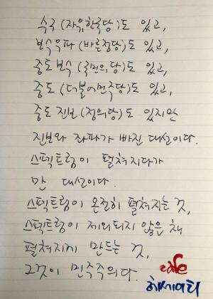 우리는 사실 다 안다.쉽게 빠진 사랑은 또 쉽게 끝난다는 것을!어렵사리 이룬 사랑은, 거기에 오해와 이해를 거친, 의리와 존중과 배려가 겹쳐 오래 간다는 것을!만약 당신이 문재인을 사랑하기 위해서 문재인을 지지한다면, 지금 당장 당신의 연적을 모두 무너뜨려야 하리! 그러나 당신이 세상을 바꾸기 위해 문재인을 지지한다면, 당장은 사랑고백을 멈춰야 한다. 당신이 진짜 문재인에게 가기 위해서는 아직 너무 많은 장애물들이 남아있기 때문이다. 문재인 역시 그 장애물을 걷어내고 넘어야 당신을 만날 수 있기 때문