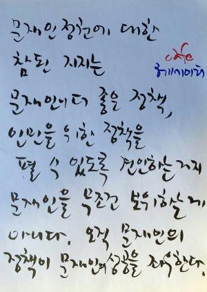대통령의 성공기준은 인격인가? 정책인가? 만약 기준이 인격이라면 가장 착하고 좋은 사람을 대통령으로 만들면 될 일이고, 만약 기준이 그 정책이라면 가장 인민을 위한 정책을 많이 제시한 사람을 대통령으로 만들면 될 일이다. 문재인의 성공을 바라는 사람은 문재인이라는 인격을 지킬 일이 아니라 문재인의 정책을 견인할 일이다. 문재인의 성공이 내 삶의 평화와 성취로 이어지려면 문재인이 인민을 위한 정책을 펼 수 있도록 감시하고, 견인하고, 비판하고, 지지할 일이다.다만 문재인을 지키는 것만으로는 문재인이라는 인격