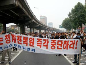 세월이 흐른 지금도 이명박 서울시장 시절의 ‘청계천 복원공사’ 이야기를 꺼내는 이유는 그 후 시장이 두 번 바뀌었어도 이 지역 개발을 둘러싼 공간의 변화와 갈등이 여전히 진행되고 있기 때문이다. 서울시는 청계천 복원사업을 추진하는 과정에서 분열과 배제 그리고 통제로 일관하였다. 분열을 둘러싼 대표적인 사례는 삼일아파트 철거민의 이주 대책을 둘러싸고 대책위원장의 매수라는 방법을 쓴 것인데, 상인들의 대책기구인 ‘청계천 상권수호 대책위원회’ 는 강건파와 온건파로 갈리고, 서울시는 자신의 입장을 관철할 수 있는 온건파를 협상 파트너로 삼