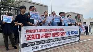 15일(월) 오후2시 부산지방법원 앞, 내란청산 사회대개혁 부산행동이 '전국 법원장회의'결과를 규탄하는 긴급기자회견을 진행했다. 본 회견에는 민주사회를 위한 변호사모임 부산지부(이하 부산민변), 부산참여연대, 민주누리회 등을 비롯한 시민단체와 조국혁신당, 진보당 등이 참가했다.첫 발언에 나선 광장대선 연합정치 부산시민연대 차성환 상임대표는 "사법부의 내란동조 행위와 뻔뻔함이 극에 달했다"고 분노의 목소리 높였으며, "빛의 항쟁을 거치며 한단계 높은 민주주의를 달성한 대한민국에 이런 사법부는 필요없다"며 강력한 사법대개혁을 주문하고