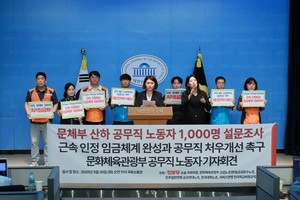 문화체육관광부 교섭노조연대와 국회 문화체육관광위원회 손솔 의원이 30일 국회 소통관에서 문체부 산하 공무직 노동자 1,006명을 대상으로 한 근속·임금 실태조사 결과를 발표했다. 이어 근속을 인정하는 임금체계 도입과 예산 칸막이 해소 등 처우개선을 촉구했다.이번 조사는 8월 25일부터 9월 19일까지 진행됐으며, 문체부 본부와 18개 소속기관, 총 19개 기관에서 일하는 공무직을 대상으로 했다.조사에 따르면 응답자의 무기계약 전환 이후 평균 근속은 6.3년, 7월 기준 월평균 급여는 226만 8천 원이었다. 근속 3년 이하의 월평균