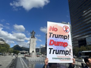 트럼프 전 미국 대통령의 방한을 앞두고 21일 오전, 시민사회와 노동계, 종교·학계 등 854개 단체가 서울 광화문 이순신동상 앞에서 ‘대미 투자강요 트럼프 규탄, 대미투자 전면 재검토’ 시국선언 기자회견을 열었다. 이들은 “3,500억 달러 현금 투자 요구는 한국을 호구로 보는 행태”라며 “굴종 외교를 중단하고 주권을 지키라”고 촉구했다. 트럼프위협저지공행동은 이후 농성에 돌입해 25일 오후 2시까지 100시간 연속 농성을 이어갈 예정이다.농성장을 지나는 시민과 외국인들까지 ‘No 트럼프’라는 구호를 보고 지지하며 인증샷을 남기기