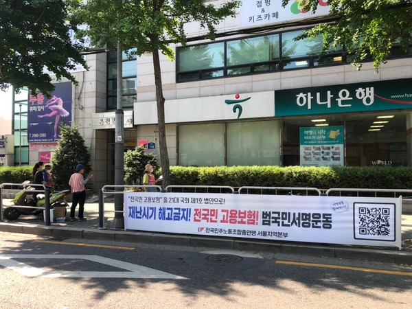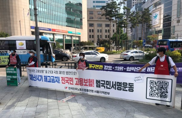 이른 아침, 두 팀으로 나눠 서울 양천구 은천빌딩과 은평구 혜민빌딩에 도착한 대행진단은 고용보험을 적용받지 못하는 특수고용노동자인 구몬 학습지 노동자들에게 ‘전 국민 고용보험 적용’ 서명을 받는 등 출근길 선전전을 시작했다.