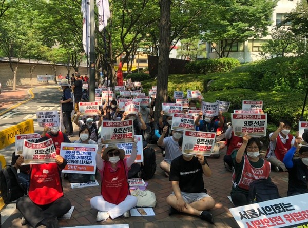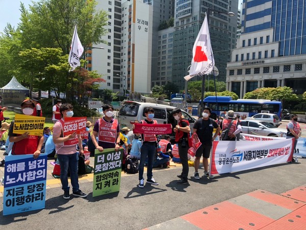 오후 3시, 서소문 서울시 의회 별관 앞에서는 서울시의회에 “9호선 민간위탁 동의안을 거부하고 공영화를 추진할 것”을 촉구했다.