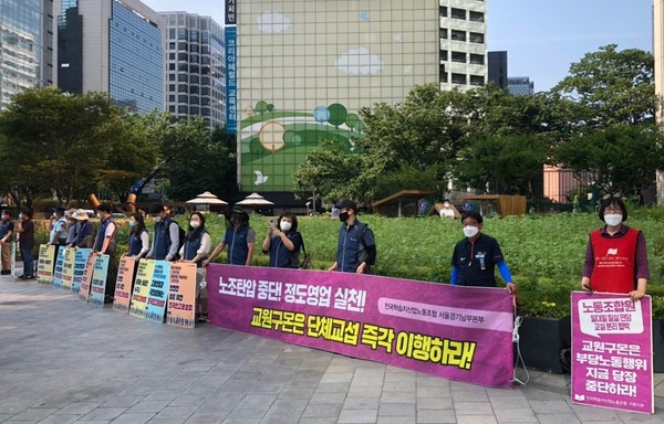 대행진단은 을지로입구역으로 이동해 교원빌딩 앞에서 교원 구몬학습의 단체교섭 불이행과 노조탄압을 규탄하는 선전전을 벌였다.