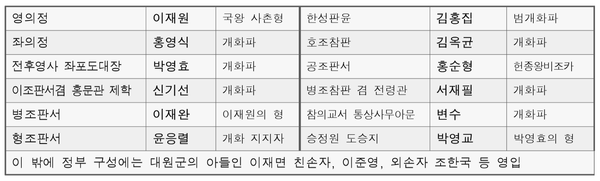 새 정부는 개화파들을 중심으로 조직되었으며 여기에 대원군 계열의 일부 성원들을 배합하였다. 그것은 당시 대원군이 청나라에 끌려가 있던 조건에서 대원군을 지지하던 세력이 민가 세도권력을 중심으로 하는 수구파 반동들의 청나라에 대한 사대 투항주의 정책을 반대하는 입장이었기 때문에 그들과 연대할 수 있는 객관적 조건이 있었기에 가능했다. 또 개화파의 사회 계급적 지반이 아직 미약하므로 그들과 연합하여 정권의 안정성을 보장하기 위한 불가피한 조처이기도 했다.