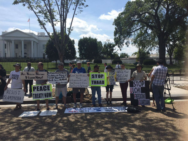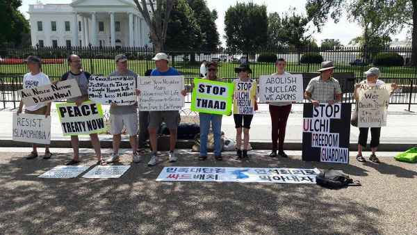 한국의 50여 개 도시에서 사드반대 전국 촛불시위가 벌어지고 있는 가운데 지난 26일 정오(현지 시각) 미국 백악관 앞에선 동포단체인 미주 민가협양심수후원회가 현지 반전평화단체 카톨릭 워커(Catholic Worker) 회원들과 함께 미국의 사드배치와 을지프리덤가디언(UFG) 훈련을 규탄하는 시위를 벌였다.