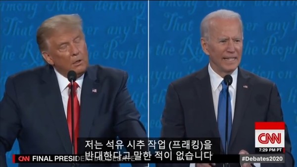 지난달 23일 대선후보 TV토론에서 바이든이 “저는 석유 시추 작업(브래킹)을 반대한 적이 없습니다”라고 공언하자, 트럼프는 “브래킹 반대했을 당시 찍힌 동영상도 있는데요?”라고 반문했고, 이에 바이든은 “이 자리에서 그 영상을 공개해 보라”며 항변했다.