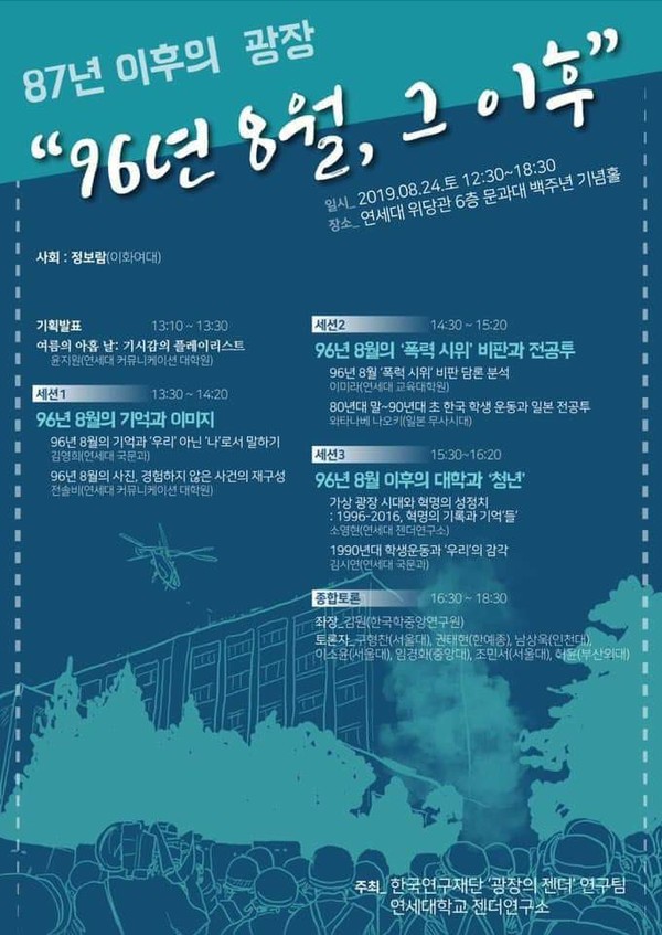지난 2019년 페이스북에서 우연히 행사 관련 포스터를 보고 깜짝 놀랐다. 도대체 96년 연세대항쟁이 어떻게 기록되고 기억되어 왔길래, 오늘 대학생들이 이런 기획을 한 것일까. (만약 행사 이전에 포스터를 봤으면 참가해서 발언했을 것이다. 날짜가 지난 후 우연히 본 포스터라 당일 내용은 확인할 수 없다)