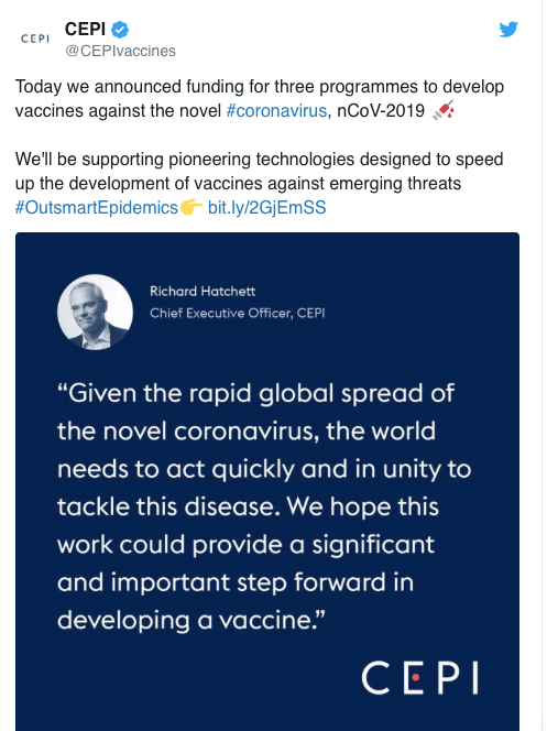 며칠 후인 2020년 2월 초, CEPI는 “주요 백신 제조업체 GSK 가 백신의 효과를 높이는 화합물인 독점적 보조제를 치료에 사용할 수 있도록 허용할 것이라 발표 했습니다 ”. (대유행 공식 발표는 3월 11일입니다).