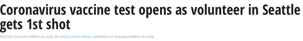 대유행은 3월 11일에 WHO에 의해 발표되었습니다. 그리고 5 일 후 언론에 거의 보도되지 않은 채로 3월 16일 시애틀에서 모더나가 인간 자원 봉사자들을 대상으로 한 첫 번째 임상 실험을 실시했습니다.