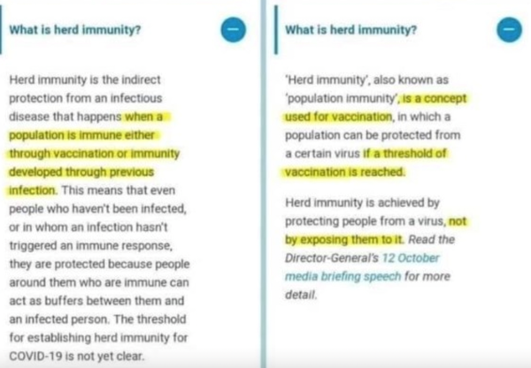 아래 (왼쪽)는 공식 WHO 정의 (2020 년 6 월)입니다. 그리고 11 월 (오른쪽) WHO는 집단면역을 달성하기 위한 예방접종의 역할에만 초점을 맞추면서 기본적인 의료 개념을 재정의하기로 일방적으로 결정했습니다.