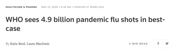 20억 명의 사람들에게 영향을 미치는 H1N1 전염병은 없었습니다. 대형 제약회사의 정부는 수백만 용량의 독감 백신을 주문했습니다. 그 후 수백만 개의 백신이 생산되었습니다. 대형 제약회사의 재정적 대가는 국가 정부의 지출위기였습니다.