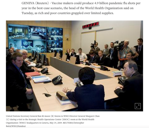 "백신 제조업체는 최상의 시나리오 하에서 매년 49 억개 분량의 유행성 독감 예방 주사를 생산할 수 있습니다.", 마가렛 찬, 세계보건기구 사무총장, 로이터 인용, 2009년 7월 21일).