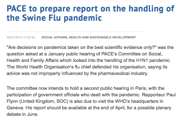인권 감시기구인 유럽 평의회(PACE)는 전염병을 선포하는 WHO의 동기를 공개적으로 조사하고 있습니다. 실제로, 권위있는 보건위원장인 전염병 학자 볼프강 보더르크는 "가짜 유행병"이 "세기 최고의 의학 스캔들 중 하나" 라고 선언했습니다. (마이클 포멘토, 포브스 , 2010년 2월 10일)