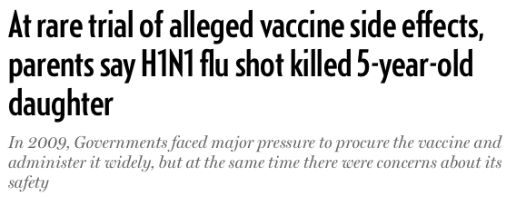 그녀의 불쌍한 부모는 독감 예방 주사에 문제가 있음을 지적하고 백신 제조업체인 GSK를 420 만 달러에 고소했습니다. 소송에 대한 공판은 주목을 끌지 않은 채로 화요일에 끝났으며, 백신의 부작용이 의심되는 캐나다에서 재판방송은 거의 이뤄지지 않았습니다.