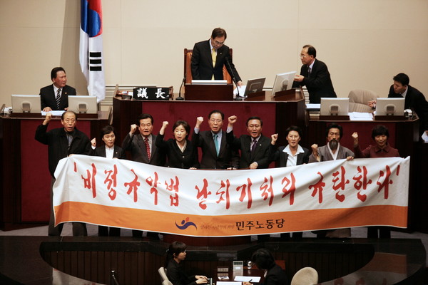 하지만 민주노동당은 과거 러시아 볼셰비키당의 <프라우다>와 같은 자신의 독자적인 영향력 있는 언론매체를 갖지 못했다.5) 그렇다고 한국의 보수언론이 일부러 진보정당의 활약을 선전해 줄 리 만무하다. 강기갑 의원의 ‘공중부양’ 사건에서 보듯, 그들은 오히려 진보의원의 활약을 희화화하고 왜곡선전을 일삼았다. 결국 충분한 정치선동이 뒷받침되지 못한 상황에서 민주노총 등 외부 대중조직의 호응은 기껏해야 ‘연대집회’ 수준을 벗어날 수 없었다