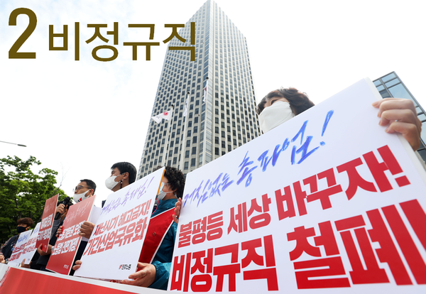 정부가 통제력을 갖고 있는 공공부문도 이럴진 데, 민간부문 비정규직 문제 해결은 거의 전무한 상태다. 정부가 비정규직 사용사유제한 도입, 비정규직 차별금지 특별법 제정, 차별시정제도 전면 개편, 파견·도급 구별기준 재정립 등을 얘기했지만, 집권여당이 21대 국회의 다수의석을 차지하고 있음에도 비정규직 입법 노력은 실종된 상태다. 오히려 법망을 거스른다. 현대위아 평택공장 노동자들처럼 법원이 불법파견을 판결했음에도 직접고용 되기는커녕 공장폐쇄로 일터에서 쫓겨나는 게 비정규직 노동자들의 현실이다.