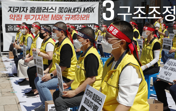 홈플러스 노동자들은 회사의 대주주인 사모펀드 MBK파트너스(MBK)가 홈플러스 인수 당시 투자금을 회수하기 위해 매출이 높은 매장의 문을 닫고, 부동산을 팔아치우면서 구조조정 위기에 처했다. MBK 인수 후 홈플러스 인력은 벌써 9천 명이나 줄었다. 일본 산켄전기가 창원 수출자유구역에서 47년간 온갖 특혜를 받는 동안 7번이나 구조조정 당하고 올해 폐업까지 발표한 한국산연, 30년 흑자기업이지만 중국 공장 이전에 따라 구조조정을 단행한 한국게이츠 등 노동자들이 구조조정 당하는 사이 정부가 한 일은 아무것도 없다.