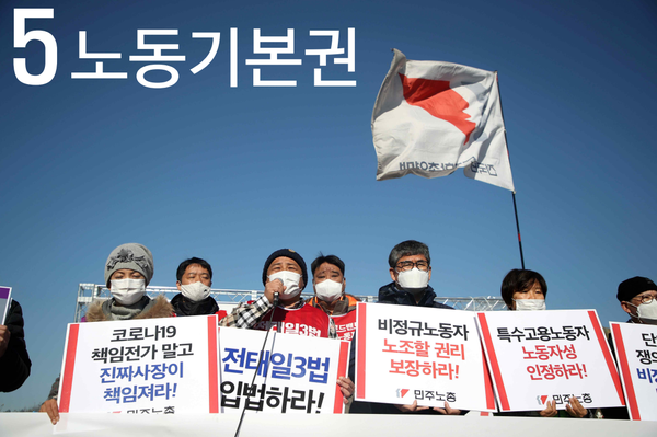 민주노총은 이 자리에서 코로나19로 더욱 심화된 양극화와 불평등 구조를 타파하기 위해 ‘5인 미만 사업장 노동자 차별 해소’, ‘산재사망 중대재해 대책 마련’, ‘공공부문 비정규직 등 비정규직 문제 해결’, ‘노동기본권 보장’ 등을 제기한 후, 시급한 의제와 현안 등을 논의할 노-정 교섭을 요구했다.