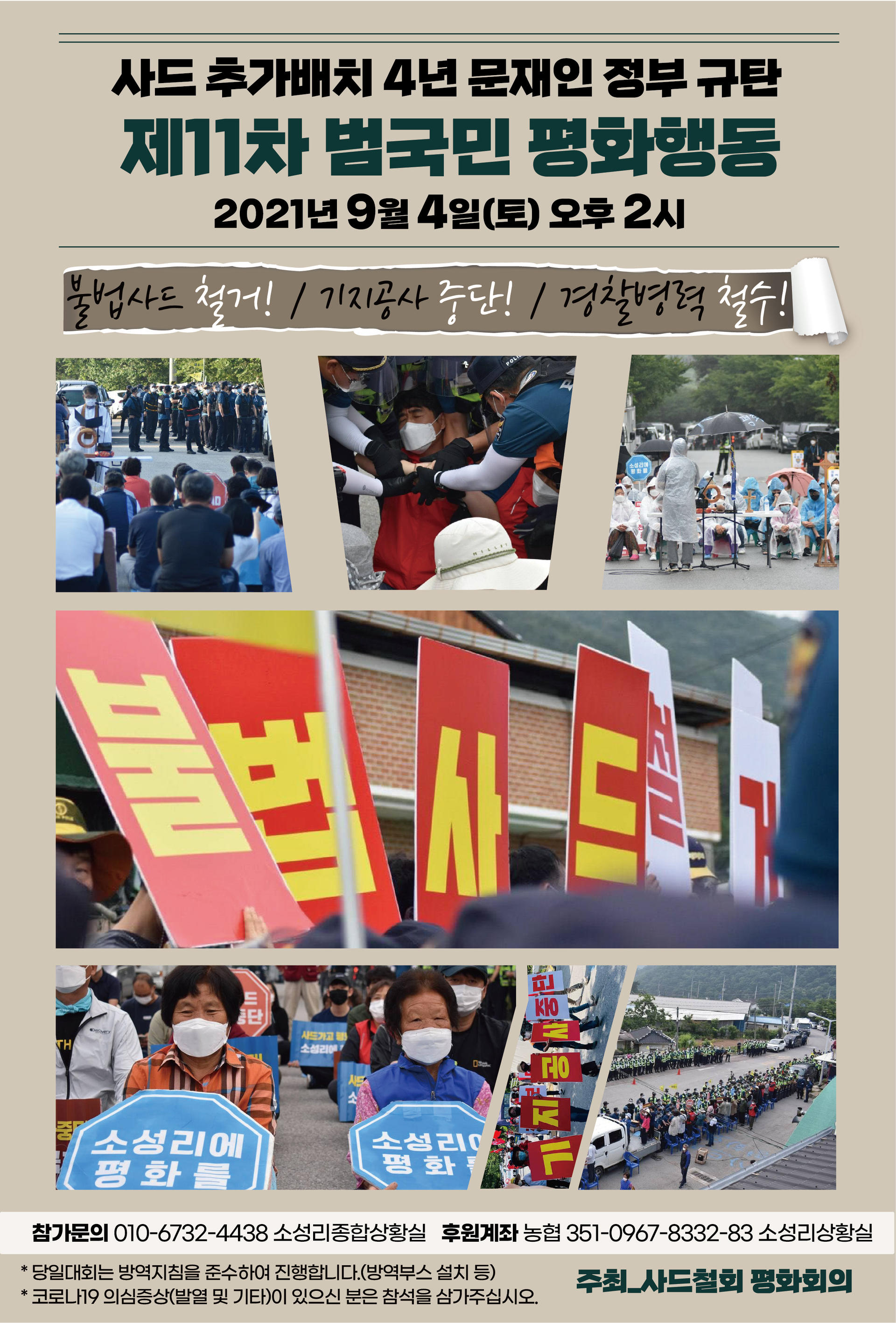 9월 7일이면 사드 추가배치 4년이 되는 날입니다. 미국의 MD체계 편입시켜 한반도를 군사기지화하고, 매주 2차례 경찰병력을 동원해 주민들과 평화지킴이를 탄압하고 있습니다. 이를 방조하는 문재인 정부를 규탄하고, 소성리를 평화의 땅으로 만들기 위한 결의의 장으로 함께 모여주세요!