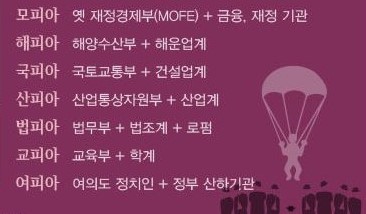 나아가 건설 부동산, 농협 등 각종 산업경제영역에서 해외자본, 재벌, 관료간의 유착세력, 즉 건피아, 원피아, 교피아, 세피아 등 관피아를 타파하고. 관료독점적 부정부패세력을 척결하는 민주주의적 경제개혁을 추진해야 한다.