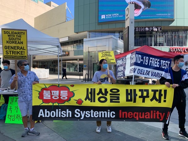 나성에서 한인동포들과 미국의 진보단체 Answer Coalition, International, Struggle La Lucha 회원들이 모여 사회대전환 불평등 세상을 바꾸는 1020 민주노총 총파업을 지지 성원하는 집회를 열었습니다.