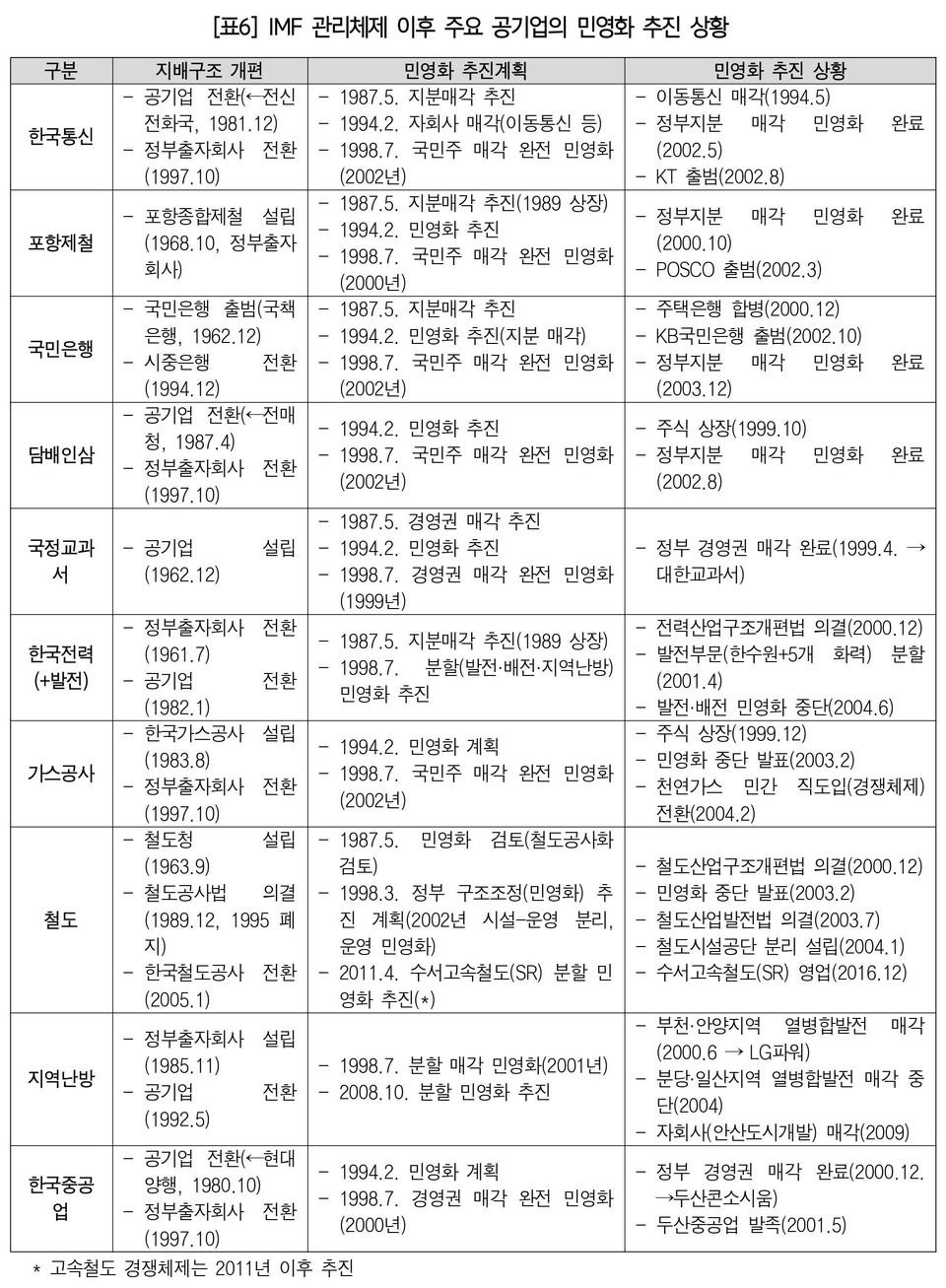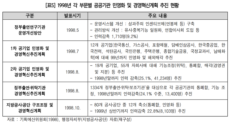 김대중정부는 IMF 양허안(1997.12)에 따라 △국가 재정 및 시장․금융 개입 축소 △재정 건전화(공기업 경영권․지분 매각) △전 공공부문 구조조정 등의 전략 아래 김영삼정부가 기획한 공기업 민영화를 전면적으로 추진하게 된다.