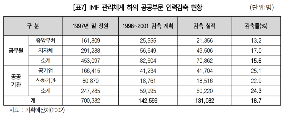 공기업 민영화와 아울러, 공공부문 경영혁신 및 고통 분담 취지 아래 전 공공부문에 걸쳐 20% 이상(14만여 명)의 정규 인력이 2002년까지 감축되었다(2002, 기획예산처). 공공부문의 정규 인력 감축은 결과적으로 전 공공부문에 걸쳐 비정규직의 대폭 증가로 이어졌다. 경영혁신의 일환으로 공공기관에 대해 복지 축소 조치(공공기관 퇴직금누진제 폐지 등)도 아울러 취해졌다. 경영혁신 선도 차원에서 전격적으로 이뤄진 공공기관 퇴직금누진제 폐지와는 다르게, 공무원 연금제도 개악 조치는 2010년대 이후 추진되기에 이른다.