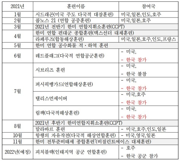 올해 진행됐던 한국이 참여한 한미일․다국적 연합훈련을 보자. 2021년 6월 레드플래