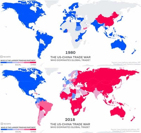 실제 1980년 세계 1위 교역 상대국이 모두 미국이었던 데서, 2018년 기준 세계 190개국 중 128개국의 최대 교역상대국이 중국으로 바뀌었다.
