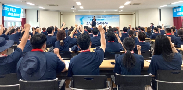 앞서, 노동자 통선대는 지난 20일 부산 미 영사관과 부산지방노동청 앞에서 대우조선 하청노동자 파업 지지 및 한미일 군사동맹 반대 선전전 등 사전활동을 벌이기도 했다.