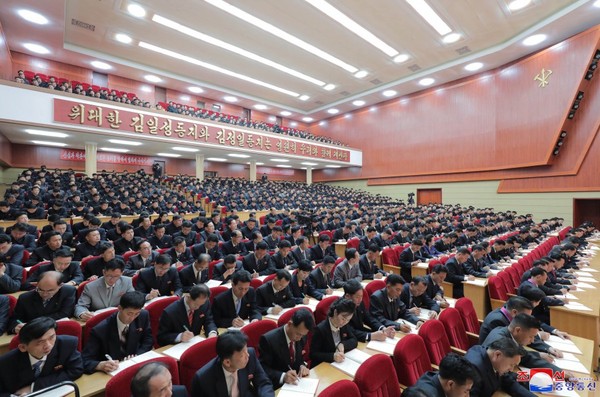 김정은동지께서 기념강의를 마치시자 주체혁명의 새시대의 요구에 부응한 우리 식의 독창적인 당건설사상과 리론을 접하게 된 무한한 감격에 넘쳐 참가자들이 터치는 폭풍같은 환호성과 우렁찬 박수가 장내를 진감하였다.