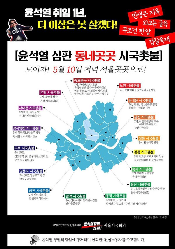 서울은 저녁 7시를 전후해 16개 자치구에서 “윤석열 취임 1년, 더 이상은 못 살겠다! 동네곳곳 시국촛불”이 열렸다.