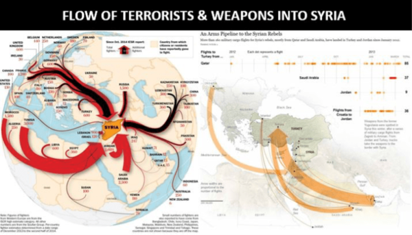아니다. 실제는 2011년부터 수만 명의 외국인들(알 카에다 및 기타 지하디스트)이 아사드를 전복시키기 위해 시리아로 파견되었다. 미국과 동맹국들-사우디아라비아, 카타르, 터키, 요르단-이 무기를 구매하고 반군에게 수송하는 일을 도왔다. 미국, 영국, 프랑스, 이스라엘의 특수부대도 "온건한 반군"이라고 알려진 테러리스트를 무장시키고 훈련시키는 데 수십억 달러를 소비했다. 시리아에서 일어나고 있는 일은 내전이 아니라 대리전이다.