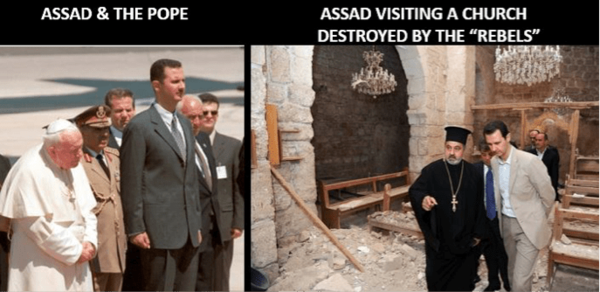 아사드는 기독교인과 다른 소수자를 보호했다. 시리아에는 샤리아법(이슬람 기본법)이 없으며, 종교적 소수자들에게 완전한 자유가 있다. 시리아에서 '억압'된 유일한 그룹은 수십 년 동안 금지된 폭력적인 무슬림형제단이다. 시리아 야당은 지난 10년 간 시아파와 기독교인들을 박해하고 살해한 수니파 극단주의자들로 구성되어 있다.