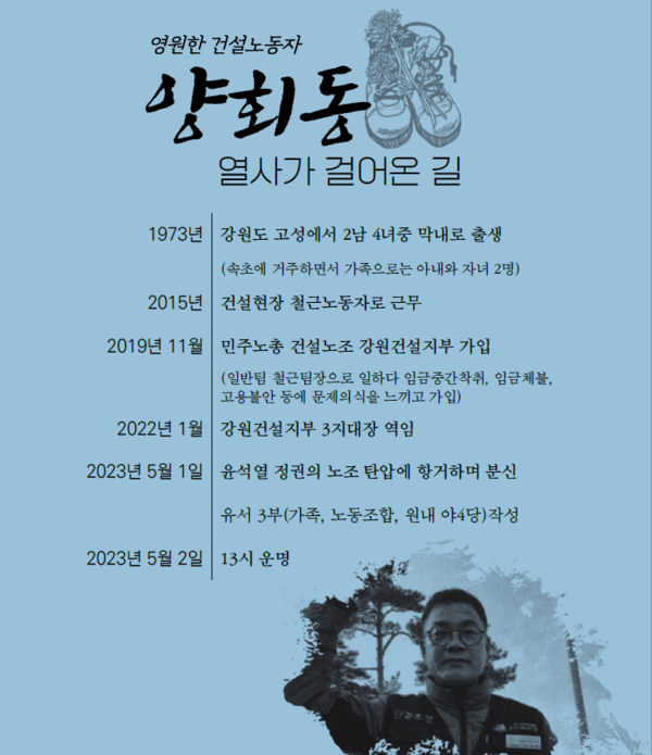 양경수 민주노총 위원장은 “윤석열 정권을 끌어내릴 수 있는 힘이 우리에게 있다는 것을 양회동 동지는 알려주었다”면서, “양회동이 옳고, 윤석열이 틀렸다는 것을 증명하자”고 호소했다.