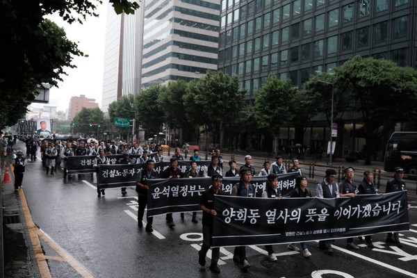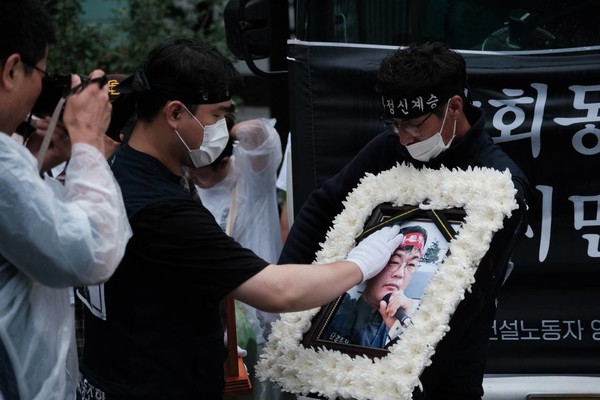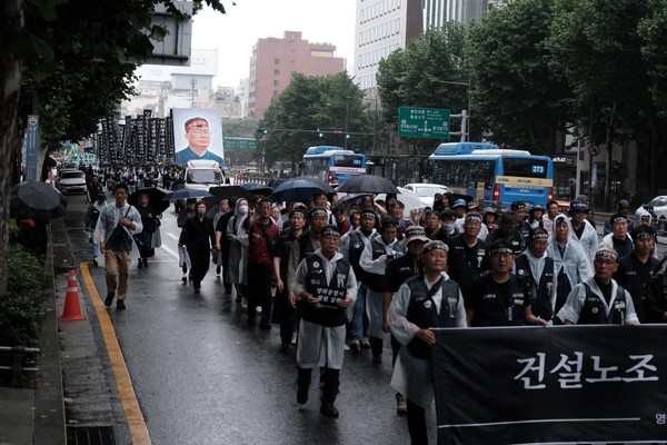장례식장 입구부터 큰 도로까지 건설노조 조끼를 입은 노동자들로 가득 찼다. 민주노총을 비롯한 시민사회도 빗속을 뚫고 장례식에 참석했다.